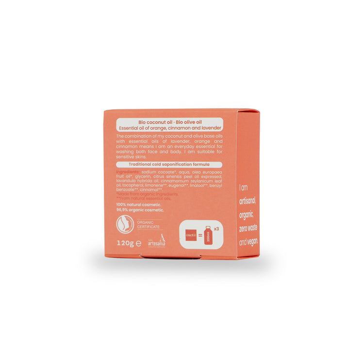 Sodium cocoate, aqua, olea europaea fruktolje*, glyserin, citrus sinensis peel expressed, lavandula hybrida olje, cinnamomum zeylanicum bladolje, tokoferol, limonene**, eugenol**, linalool**, benzylbenzoat**, kanel**.