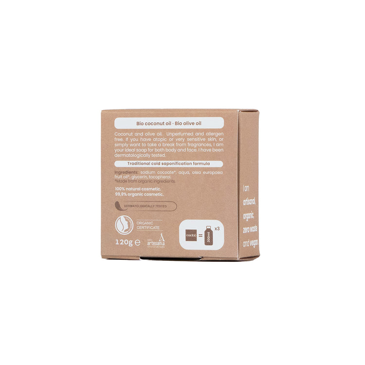 Essabó Unscented er en økologisk badesåpe fri for allergener fra parfymer eller essenser. Basen er laget med kokosolje fra bærekraftig landbruk og olivenolje fra spanske økologiske avlinger.