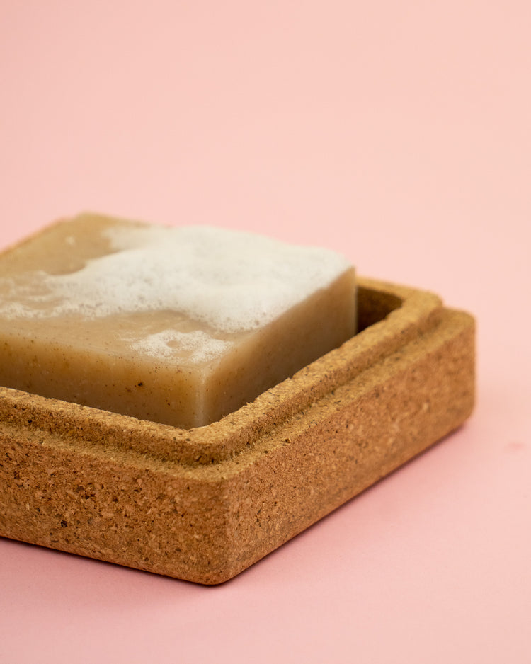 Den er laget av 100% spansk kork, perfekt for å oppbevare og beskytte din solide sjampo i dusjen eller badekaret, eller for bruk som en bærbar reise-såpeskål.