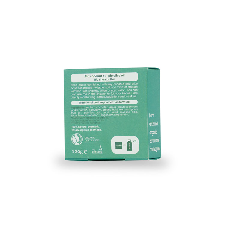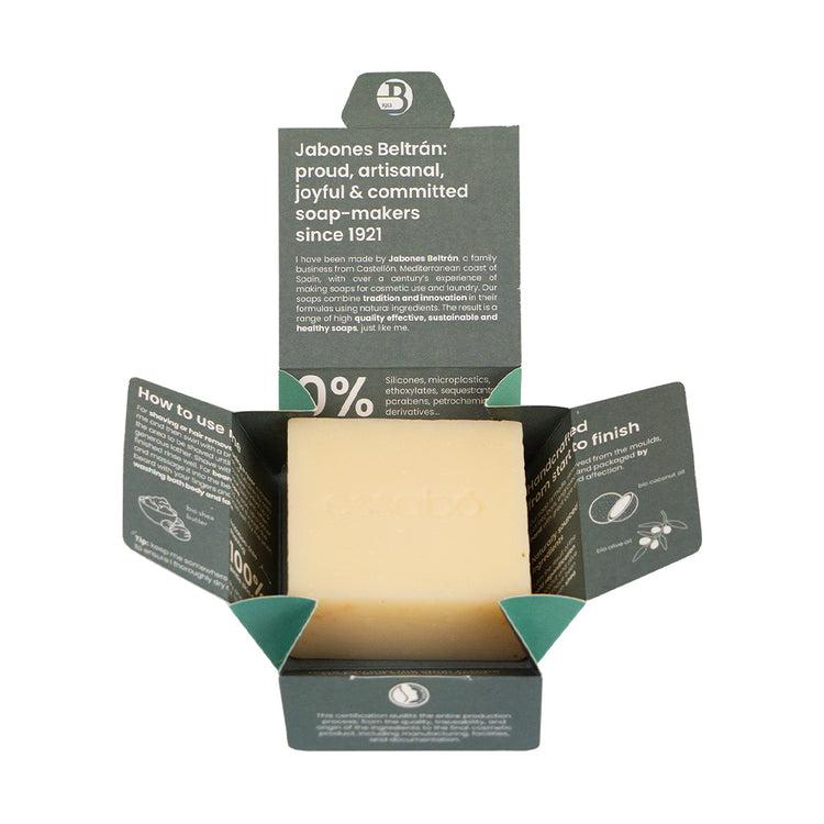 Essabó Afeitado er en såpe utviklet spesielt for en klassisk barbering på den mest naturlige måten. Takket være det kremete skummet gjør den barberingen enklere samtidig som den tar vare på selv den mest sensitive huden, og forhindrer irritasjon. Den kan også brukes til å vaske langt skjegg, rense og pleie håret og huden.